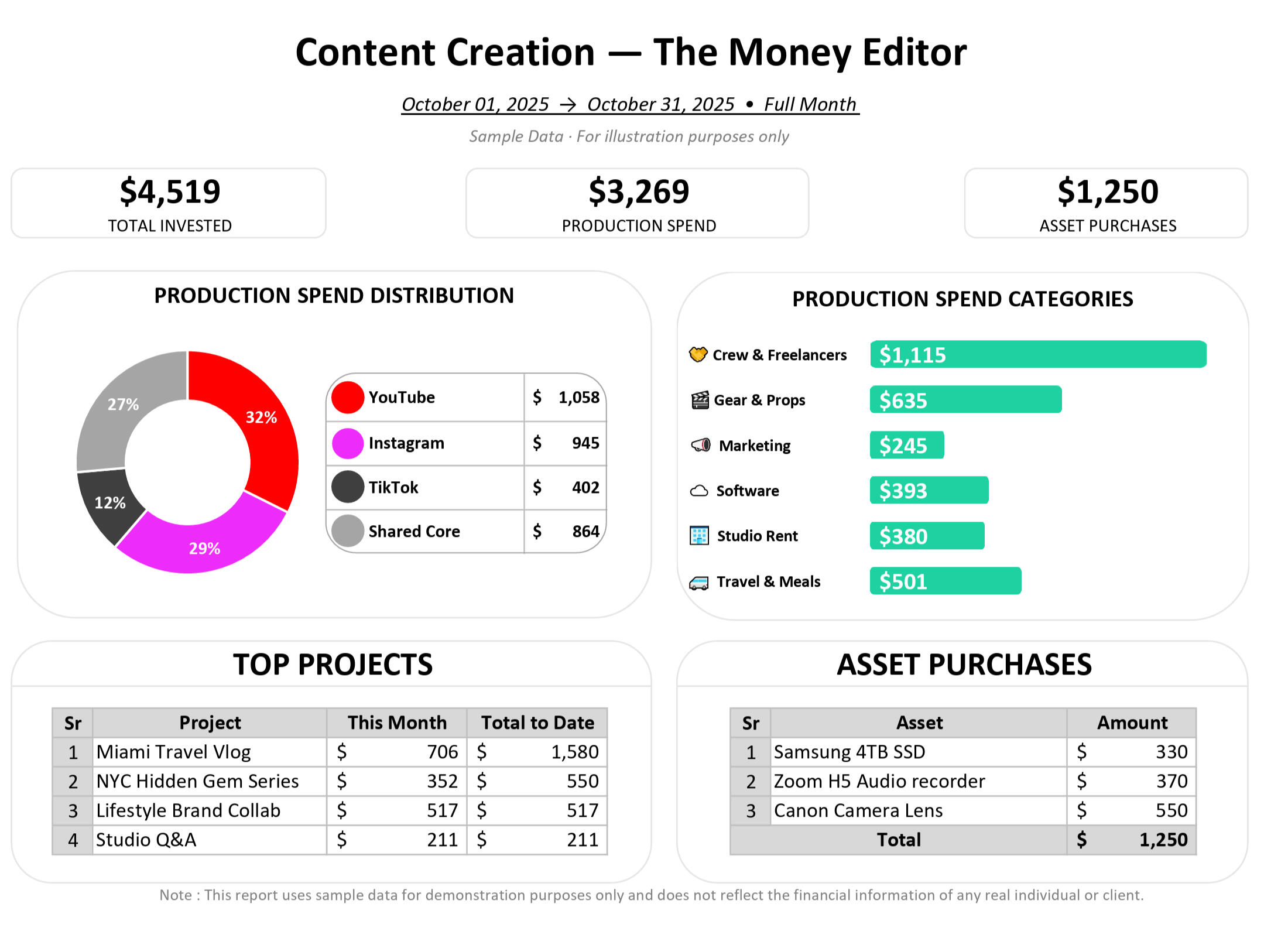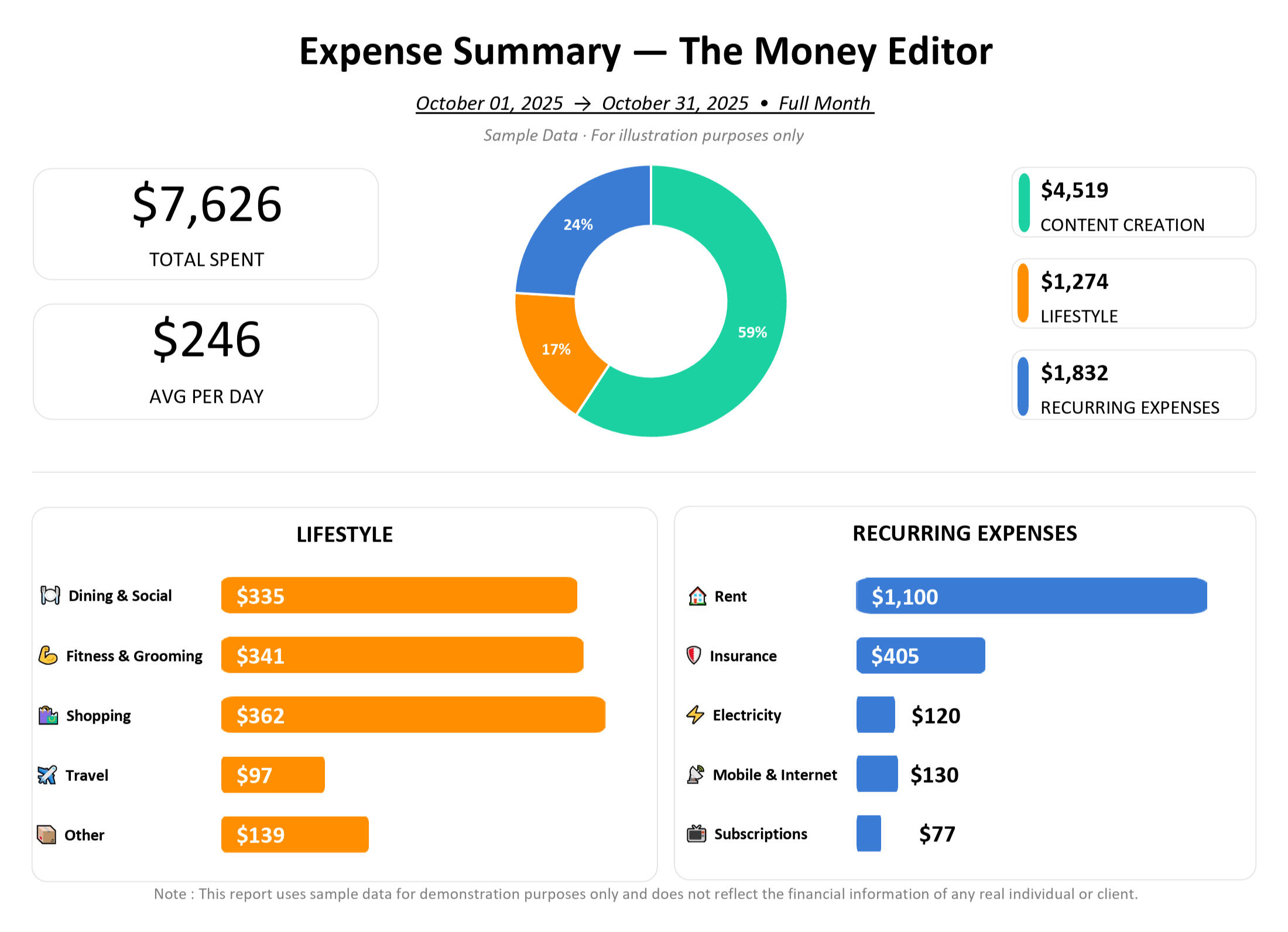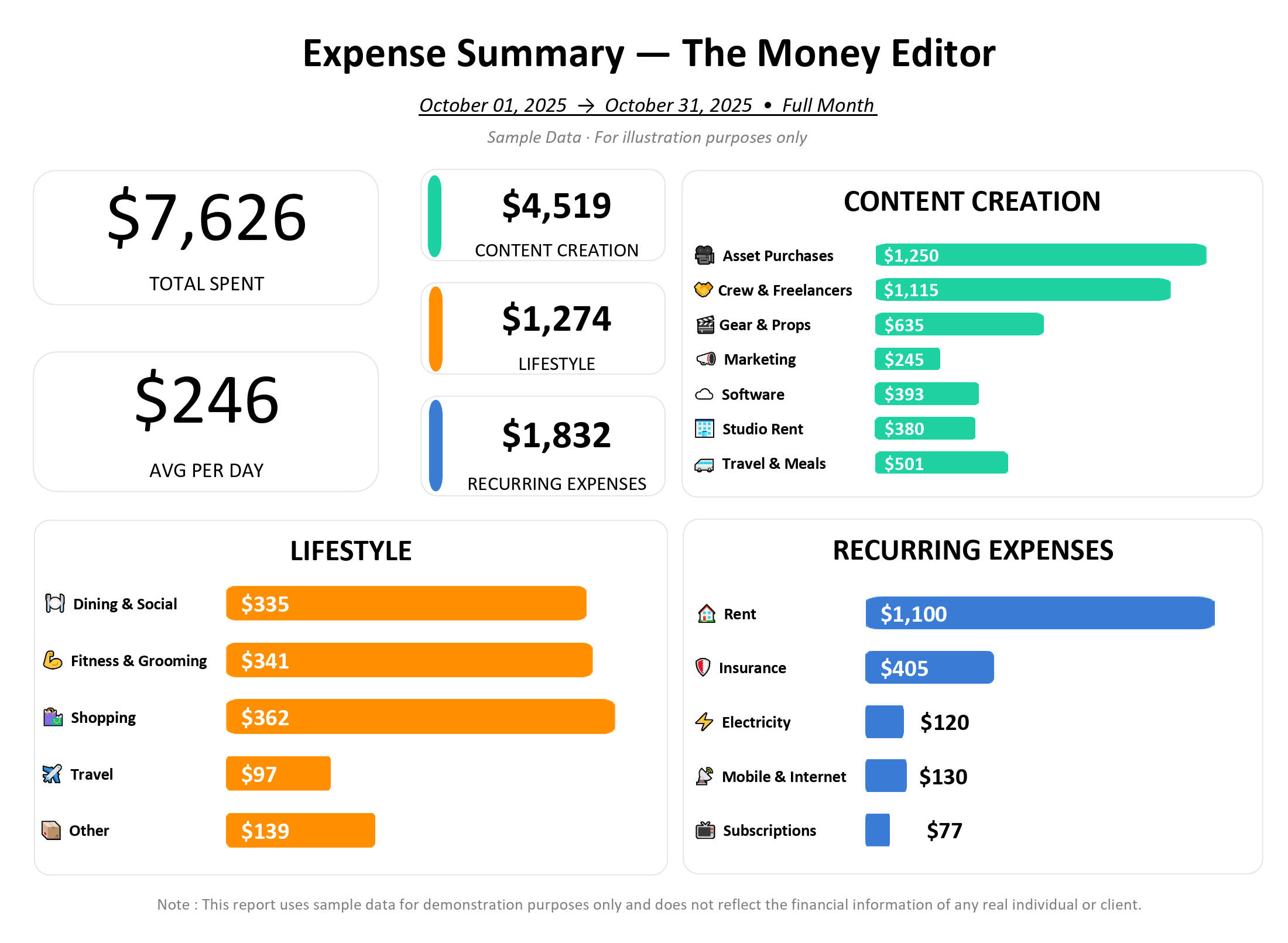 A clean monthly archive of every logged expense — delivered privately with your dashboard.
